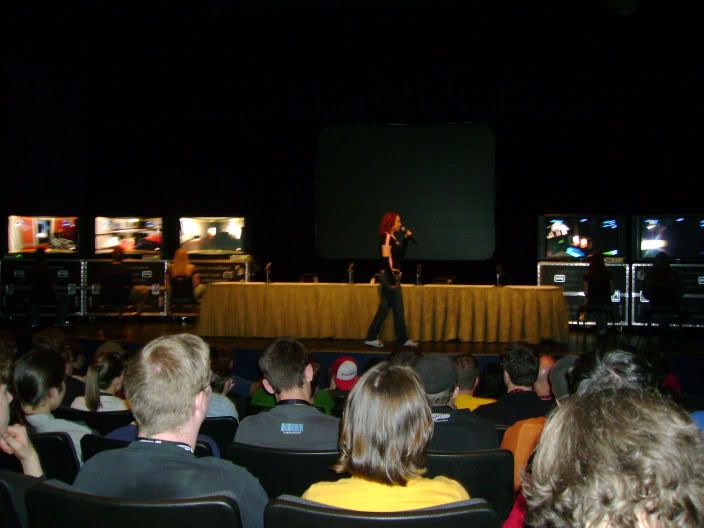 Went to the Ubisoft presentation next. The line was truly amazing. If I hadn't been in it, I would have taken a picture even more crowded than the one at the top of this post. Look at the first pic in this post and imagine a line that goes from around the far corner, all the way to the staircase to the right, and then halfway to the doorway on the bottom floor. Not to be deterred, I got in line. After a 45 minute wait, I did manage to get a seat. No Assassin's Creed was shown, they were expecting it up until the last minute, but the developer said it wasn't ready. First up, the new Splinter Cell. For this part, two of the Frag Dolls talked about the game.
